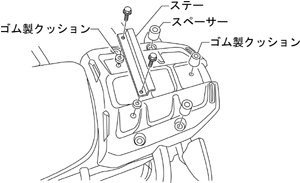 カバーに開けた3箇所の穴に手前側は厚さ3mm程度のゴム製のクッションをステーとの間に挟み、後ろ側は20mm程度のゴム製のクッションをトップベースとの間に挟んで取り付けました。